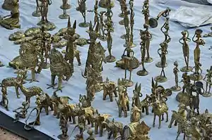 There is a group of families involved in making dhokra craft at Dwariapur. They originally belonged to the former princely Bastar state in Central India, now Bastar district in Chhattisgarh. They migrated to what is now Dhenkanal district in Odisha and then on to Medinipur, Bankura, Purulia and Bardhaman - they were scattered all around. In Purba Bardhaman district, they settled in Dwariapur. They make metal castings by a process that is believed to have been practised from ancient times and they learnt the traditional intricacies from their fore-fathers.[2]