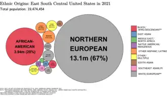 As of 2020, the East South Central states had a combined population of 19,430,030. The East South Central region covers 183,401 square miles of land. Within the region, Tennessee is the largest state by population, though Alabama is the largest by land area; Tennessee was also the East South Central's fastest growing state between 2010 and 2020,[14][15] with Alabama second.[16] Kentucky was the third-fastest growing state,[17] and Mississippi experienced population decline; despite population decline, Mississippi did increase in diversity.[18][19]