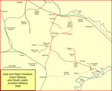 Continuously short of money for construction purposes, the E&WYUR approached the GNR in February 1892, asking it to take it over. The GNR board was willing to consider this, but was cautious about the financial commitment it would be making, and referred the matter to a sub-committee.[4] The issue became complicated: at this time Hunslet had become a major industrial and commercial growth area, and business interests put forward a new line to the north of the E&WYUR, from Beeston to Hunslet; this group approached the GNR for support. At the same time the E&WYUR proposed an extension of its own line to Hunslet, which was to be called the South Leeds Junction Railway. The GNR considered its position on these conflicting proposals, and decided that the line from Beeston would be better, being more direct and involving less property demolition. That line became the Hunslet Railway, opened in 1899 by the Great Northern Railway.[7][4] In May 1892, takeover negotiations between the GNR and the E&WYUR broke down, as the E&WYUR wanted 4% on its share capital, a demand the GNR would not meet.[8] The Beeston to Hunslet scheme proceeded separately, and had no further connection with the E&WYUR.[9][4]