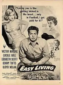 Easy Living is a 1949 American drama film directed by Jacques Tourneur, starring Victor Mature, Lucille Ball and Lizabeth Scott.[1] The film features the real-life Los Angeles Rams football team.