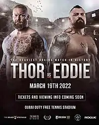 Eddie Hall vs. Hafþór Björnsson, known as "The Heaviest Boxing Match in History" at its time,[5][6] was a boxing match between strongmen Eddie Hall and Hafþór Björnsson that took place on 19 March 2022. Both have won the strongman competition "World's Strongest Man" owned by IMG Worldwide. Prior to Hall's injury, the match was set to take place on September 18, 2021, at VyStar Veterans Memorial Arena in Jacksonville, Florida.[7] The replacement match in September 2021 was between Björnsson and Devon Larratt in Dubai while the match against Hall was rescheduled to March 19, 2022.[8]