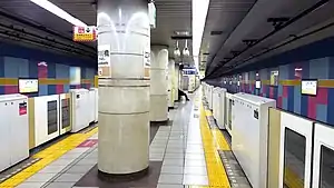 The station, which is underground, consists of an island platform and two tracks. There is an elevator between the ticket gate level and the platform level. The toilets are on the first underground floor, outside the ticket gates. In 2005, a multi-function toilet, including facilities for infant care and the physically disabled were installed.