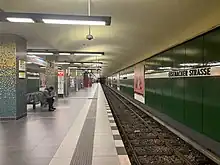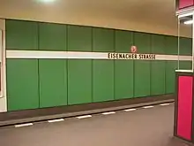 Eisenacher Straße is a Berlin U-Bahn station located on the U7. R.G. Rümmler constructed this station which was opened 1971.[1] The wall is covered with green asbestos cement panels. Since Eisenach is a city near the forest in Thuringia, which is called the green heart of Germany, Rümmler chose green as the color of this station. The next station is Kleistpark.[2][3]
