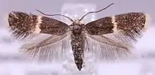 The wingspan is 9–11 millimetres (0.35–0.43 in). Adults are pale grey with a whitish head and a white transverse line across the center of the forewing. They are on wing from May to July and again in August in two generations per year.[2]
