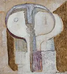 De Laittre returned to New York in 1940 when her husband began graduate studies at Columbia University.[1] She continued to participate in group and solo exhibitions. After receiving his degree in 1943 her husband served as a naval officer in the Pacific Theater and during that time he and she divorced. He returned to Chicago while she remained in New York.[16] At this time de Laittre became a member of American Abstract Artists, a group that had formed a few years earlier to promote and exhibit non-representational art.[17] Speaking for the group, George L.K. Morris argued for acceptance of a "living and expressive" art, acting "through combinations of form and color and line without representing definite objects" and he defended the group's "international" style, evolved out of European modernism, against those who considered it to be un-American.[18]