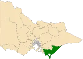 The electoral district of Gippsland South (initially known as South Gippsland)[1] is a Lower House electoral district of the Victorian Parliament.[2] It is located within the Eastern Victoria Region of the Legislative Council.