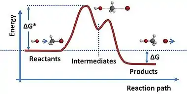 A typical reaction path requires the initial reactants to cross an energy barrier, enter an intermediate state and finally emerge in a lower energy configuration. If charge separation is involved, this energy difference can result in an emf. See Bergmann et al.[35] and Transition state.