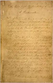 ![]() The five-page original document, held in the National Archives Building – until 1936 it had been bound with other proclamations in a large volume held by the Department of State[1] | |