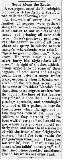 Booker T. Washington, as a boy of 9 in Virginia, remembered the day in early 1865:[97]