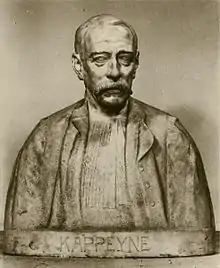On 6 February 1921, a marble bust by Epple of Dutch Senator Jacobus Kappeyne de Capello, his former wife's uncle, was unveiled in the Stedelijk Museum. The bust is still on display in the hall of the Dutch Parliament in The Hague.[6] In 1928, Epple was nominated Professor honoris causa by the Reichsakademie München, having just completed four huge statues for the Saint Josephospital. After the rise to power by Adolf Hitler as Reichskanzler on 30 January 1933, and, subsequently, the suspension of civil rights, the increase in paramilitary violence, the Enabling Act, turning Hitler’s government into a dictatorship, and the utterly racist Nuremberg Laws in 1935, Epple had his family moved to the Netherlands.