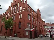 The first commemorative plaque was funded by the local Sokół association and unveiled in 1936, on the wall of the Polish House at 11 Warmińskiego street. After its destruction by the Nazis, the "Halka" Singing Society placed a new one on the very place where the previous stood: it was inaugurated on 14 June 1958 for the occasion of the 75th anniversary of the association.[12] This plaque stood until the demolition of the building in February 2019: however, the commemorative plaque will be positionned back on the plot at the end of the building works.[13]