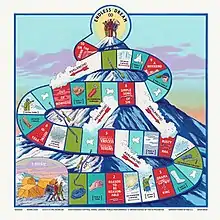 The front cover artwork, depicting the band members looking up at three peaks of a mountain range, follows the consistent motif of having the three band members or three similar objects on each of their album covers. The cover was designed by Frans Enmark and illustrated by Graham Samuels, who had previously illustrated the artwork of their third album Writer's Block.[6] The rear cover artwork for the LP is a functional board-game board illustrated in the same style featuring the tracklisting embedded into the path of the board game.[7]
