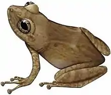 Eneida's coquí (Eleutherodactylus eneidae) is a species of coquí, a small variety of frog endemic to the main island of Puerto Rico and its archipelago. Known as coquí de Eneida in Puerto Rico, this amphibian is mainly terrestrial. Its average adult size is from 1.0 to 1.2 inches.[2] It has a number of small warts located across its back and eyelids.[3] Its main color is a light tone of greenish or grayish brown with a yellow tint on its underbelly. They often have a pair of light colored concave lines located on their backs. Their eyes are golden or green colored, generally dark colored with black venal reticulation. Its habitat is located in mountains that are 1,000 to 3,000 feet above sea level.[2] This species seems to have suffered a population reduction, in the process disappearing from areas formerly considered its natural habitat.[2] The reason behind this reduction is under study, and Eneida's coquí has been designated an endangered species until the cause is discovered. This population decrease is not considered to be linked with the loss of its habitat, which has prevented the protection of its habitat.[2]
