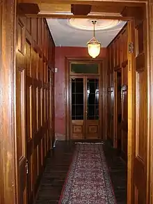 The main structural walls are fourteen inches thick with internal panelled reveals. It has six-panelled cedar doors and cedar chimneypieces. There are seven bedrooms, including two attic rooms (in very original condition), and maid's room over the old kitchen. On the first floor, at the street front, a single room runs the full width of the house, divided into two rooms and a hall by removable cedar floor-to-ceiling panelling incorporating a hinged door leaf. By virtue of its having a central ceiling rose, fireplaces at each end and a continuous boarded floor, the room architecturally reads as a single space, and may derive from the English model of a large first floor reception room that can be adapted for day-to-day use. (This feature is found in a number of Maitland residences all built around the same time: Walli House, Roseneath, the Eckford house and outside Maitland most notably at Franklin House in northern Tasmania.)[1]