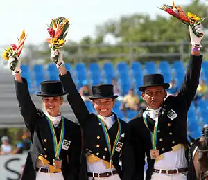 After the dressage test, the United States led with 143.40 penalty points, closely followed by Canada with 159.90 penalties, then host country Brazil with 173.20 in third, Argentina in 4th, and Chile in 5th.