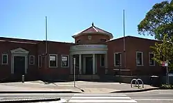 By the 1930s, with the announcement of the widening and realignment of Erskineville Road, the Victorian-era town hall was set to be demolished. As a consequence, Erskineville Council commissioned plans for a new town hall on a site adjacent to the old hall.[5] In 1936, an initial design by Sydney Architect Lindsay Gordon Scott was accepted. This design was an ambitious one, including two stories and a 75-foot-high clock tower.[6] This design however was found to be too expensive and grand for a small municipality in a primarily working-class area of Sydney and was revised to be the current design of a single storey building without the tower in a similar red brick Georgian revival style. In a tribute to the former council chambers, glass from the original town hall was incorporated into the new offices.[5][7]