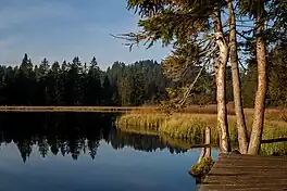 Etang de la Gruère is a small lake in the Jura range near Saignelégier, Canton of Jura, Switzerland. The lake and the surrounding bog is a nature preserve. The lake was formed in the 17th century, when a dam was built for a mill.