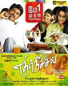 Ethir Neechal (transl. Swimming against the tide) is a 2013 Indian Tamil-language sports comedy drama film written and directed by R. S. Durai Senthilkumar in his directorial debut. The film stars Sivakarthikeyan, Priya Anand and Nandita Swetha. Produced by Dhanush under his studio Wunderbar Films, it was distributed by S. Madhan under the banner Vendhar Movies.[2] Principal photography commenced on 23 July 2012, and was ended on 22 February 2013. The music for the film is composed by Anirudh Ravichander, with cinematography performed by Velraj and editing by Kishore Te. The film was released on 1 May 2013 to generally positive reviews and became a blockbuster.