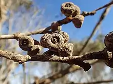 - 1 2 Nicolle, Dean; French, Malcolm E. (2012). "A revision of Eucalyptus ser. Falcatae (Myrtaceae) from south-western Australia, including the description of new taxa and comments on the probable origin of E. balanites, E. balanopelex, and E. phylacis" (PDF). Nuytsia. 22 (6): 448–450. Retrieved 16 February 2019.