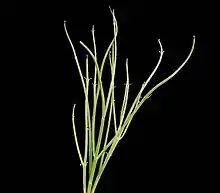 It grows to 60 or 70 cm in height, with a tuberous root-system that is often eaten by porcupines, and with thin (3-5mm), erect, grey, branching stems. The branches are dichotomous and taper to soft points.
