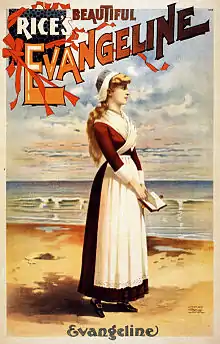 Evangeline; or, The Belle of Acadia is a musical Extravaganza, with music by Edward E. Rice (arranged and orchestrated by John J. Braham) and lyrics and book by J. Cheever Goodwin.[1] It was a comedy loosely based on Henry Wadsworth Longfellow's 1847 serious epic poem Evangeline.[2] The title character is a young American maiden of French Acadian stock, who is forced to leave her home and is separated from her beloved. A notary stalks her, holding a secret will that may prevent her from gaining her inheritance.[2]