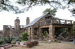 The Evelyn Gill Walker House is a historic house at 18 South Spruce Street in Paris, Arkansas. Built by mason Tolbert E. Gill over a several-year period beginning in 1938, it is a distinctive example of Gill's Rustic style, with a stone veneer exterior and decorative components. It has a 1+12-story gabled main section, with a flat-roof porch in front, and a flat-roof ell in the rear. The ell features a turret with a bell-cast top, with a surrounding curved staircase leading to an open deck on the ell's roof.[2]