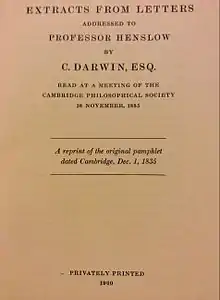 Extracts from Letters to Henslow, taken from ten letters Charles Darwin wrote to John Stevens Henslow from South America during the second survey expedition of HMS Beagle, were read to the Cambridge Philosophical Society on 16 November 1835 by Henslow and Adam Sedgwick, followed on 18 November by geological notes from the letters which Sedgwick read to the Geological Society of London. On 1 December 1835 they were printed as a pamphlet for private distribution.[1]