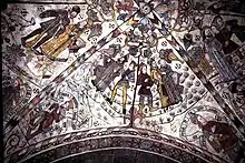 The presently visible church was preceded by a wooden stave church, built during the 11th century. The oldest parts of the presently visible Romanesque church date from about 1180. The twin tower, the nave and the choir form the oldest parts of the church. According to legend, the two towers were constructed by the wife of a local knight. The story goes that the knight went away to fight in a war while his wife was pregnant, and asked his servants to build a tower to the church in case she gave birth to a son. When he returned from the war and saw the two towers, he realised that she had given birth to twins.[1] In reality, twin western towers are not an unknown element in Romanesque architecture, although not known from any other parish church in Scania.[2] While it is unknown who built the church and why, the presence of the twin towers thus do denote high ambitions.[3] From the extensive use of finely cut and worked granite, scholars have deduced that the workers building the church probably came from Jutland, where similar granite churches exist.[3] During the 15th century, the vaults in the choir were decorated with murals. During the late Middle Ages the nave was also vaulted;[3] but when the church was enlarged towards the north in 1770, these vaults were destroyed. The southern transept was added roughly a hundred years later.[1]