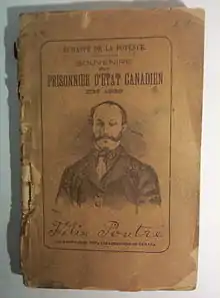 However, it was later revealed that Poutré served as a spy for the British government, which he kept informed on the Patriot insurgents' plans while they were in exile in the United States and, later on, during their incarceration at the Pied-du-Courant Prison. This came following the affirmation of Benjamin Sulte that he had been an "employee of the government" and the disclosure by Gustave Lanctot in 1913 of compromising documents, which unmasked him as a bogus patriote.[1] His claims to having actively participated in patriot actions have been seriously questioned, and it is probable that he rather acted as an agent provocateur on behalf of the British authorities.[2][3]