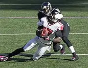 In gridiron football, the face mask is the part of the helmet that directly covers the face. It is a major source of protection for the players, made of metal covered either with a rubber or plastic coating (although early facemasks were made with pure plastic).[1]