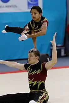 ![]() Farai Bright-Garamukanwa (top) and Kieran Whittle at the 2014 Acrobatic Gymnastics World Championships | |||||||||