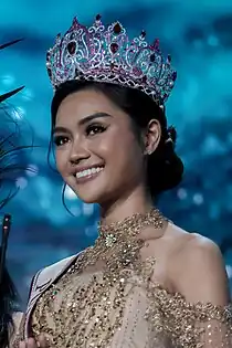Nariswari when crowned as the winner of Puteri Indonesia 2023 by her predecessor Laksmi De-Neefe Suardana and Putri Kuswisnu Wardani as Chair of the Puteri Indonesia Foundation, on 19 May 2023.