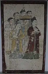 Tombs in haner families (i.e. Han Chinese of mixed origins or who have adopted some Khitan customs), for example the Zhang and Hann families, often depicts men dressed in Khitan clothing in corridors and antechambers while inner culture shows haner culture.[3] Some Han Chinese or Haner men adopted and mixed or combined Han clothing with Khitan clothing with Khitan boots and Han clothes or wearing Khitan clothes.[3]:48,52–53[17] Han women on the other hand did not adopt Khitan dress and continued wearing Han dress.[3]:48,52–53[17] For example, the tomb of Hann Shixun (a man from distinguished haner families) who died in the early 12th century during the late Liao dynasty depict Khitan-style clothing in the antechamber whereas women in Han Chinese-style clothing is seen in the painting found in the inner chamber.[3]:44–45 Another example can be seen in a mural painting found in the tomb of Zhao Wenzao, where children and servants are depicted wearing Khitan hairstyles and Khitan-style clothing, while the woman who is standing behind the table is depicted in Han Chinese clothing.[3]:46–47 During the Liao dynasty, Han Chinese women living in the Southern Division and Haner women were culture bearers, who generally preserved Han Chinese culture and continued to wear the Han Chinese clothing which was worn prior to the conquest.[3] In a tomb at Zhaitang, there are two female servants depicted standing by the doorway wearing Chinese clothing.[6]
