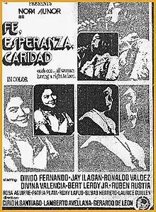 Fe, Esperanza, Caridad (transl. Faith, Hope and Charity) is a 1974 Filipino film, produced by Premiere Productions. It is a trilogy featuring Nora Aunor giving life to the stories of three women: Fe—an emerging movie superstar who has an invalid husband—, Esperanza—a young wife living in a middle-class neighborhood in the city—and Caridad—a young novice who was seduced by the devil himself.