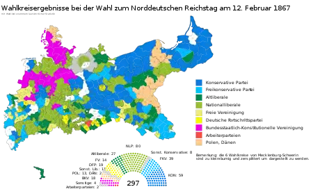 Elections to the Constituent Reichstag of the North German Confederation were held on 12 February 1867, with run-off elections during the following weeks. The National Liberal Party emerged as the largest party, winning 80 seats and receiving strong support in Hanover, Kassel and Nassau.[1] Voter turnout was around 65% in Prussian constituencies.[2] After the Constituent Reichstag had drawn up and agreed a constitution, fresh elections were held in August.