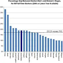 Percentage gap between median men's and women's wages, for full-time workers by OECD country, 2006. In the U.K., the most significant factors associated with the remaining gender pay gap are part-time work, education, the size of the firm a person is employed in, and occupational segregation (women are under-represented in managerial and high-paying professional occupations.)[40]