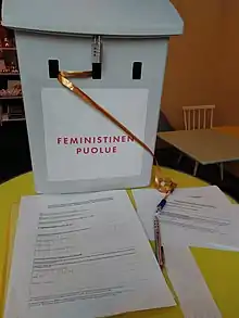 The Feminist Party (Finnish: Feministinen puolue, Swedish: Feministiska partiet) is a Finnish feminist political party. It was founded in June 2016,[3] and registered as a political party in January 2017.[4] It calls gender equality, human rights, and human security the primary pillars of its politics.[5]
