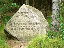 • On 10 August a new forest blaze started near Meinersen which spread towards the village. After the fire was halted shortly before the village, the wind suddenly veered and blew the 20-metre-high (66 ft) flames in a new direction. As a result, a water tender of the Volunteer Fire Service was cut off. Five firefighters from Fallersleben and Hohenhameln died in the wall of fire.
