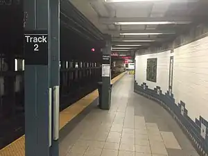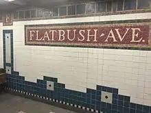 In 1981, the MTA listed the station among the 69 most deteriorated stations in the subway system.[18] As part of a plan to increase accessibility in the New York City Subway, the MTA had planned to install elevators at the Flatbush Avenue–Brooklyn College station by 1995.[19] Starting in December 1993, the station was renovated at the cost of $6 million.[20] An elevator was installed, and the 1920s-style "Flatbush Avenue" name tablets, containing red backgrounds with blue borders, were restored on both platforms.[21] The elevator was closed from July to December 2021 for replacement.[22] The top and bottom of the platform walls contain a blue solid line with a colorful border trim. This results in a tiling scheme with blue tiles that create a wavy pattern that comes farther up whenever there is a "F" tile — which stands for Flatbush — in the station's trimline.[20][23]