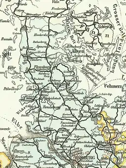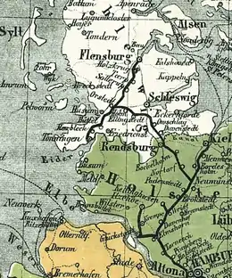 Flensburg–Husum–Tönning line with spur to Rendsburg north of the former German-Danish border (extract from German rail map of 1861)