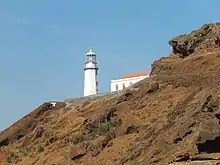 Farol de Fontes Pereira de Melo (also: farol da ponta de Tumbo) is a lighthouse at the northeastern point of the island of Santo Antão in northwestern Cape Verde. It is situated on the headland Ponta de Tumbo, 2 km east of Janela, 6 km southeast of Pombas and 15 km northeast of Porto Novo. The lighthouse was named after Fontes Pereira de Melo, prime minister of Portugal for several times between 1871 and 1886. It is a white octagonal masonry tower, 16 meters high.[2] Its focal height is 162 meters above sea level, and its range is 17 nautical miles (31 km; 20 mi).[1] The adjacent building for the lighthouse keeper is abandoned and in poor condition.[2]