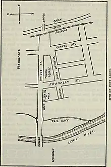 Fort Allen was a military structure built in Franklin Township (in what is now Weissport), in Carbon County, Pennsylvania in 1756. It was first of several frontier defenses erected by Benjamin Franklin for the Province of Pennsylvania during the French and Indian War.[1] The finished fort was 125 feet long and 50 feet wide, with two triangular bastions, a 12-foot high palisade, and a surrounding trench. Inside there was a well, a barracks for the garrison, a storeroom and a gunpowder magazine. Two swivel guns were mounted at opposite corners. The garrison was rarely more than fifty men, and the fort never saw combat, however it became a center of contact and trade with Native Americans and served as a stopping point for Indians traveling to and from Bethlehem, Easton and Philadelphia. It was abandoned in 1761 near the end of the French and Indian War,[2] and briefly reoccupied during Pontiac's War and again during the American Revolutionary War.[3]: 224