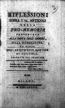 - Réflexions sur les 73 articles du Pro Memoria, présentés à la Diète d'Empire, touchant les nonciatures de la part de l'Archevéque-Electeur de Cologne. Regensburg [Cologne], 1788, 240 p., 8°