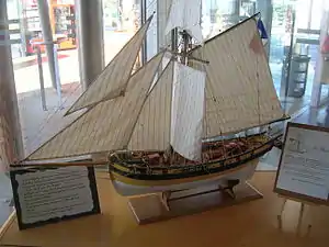 ![]() Photo of a model of the French privateer cutter Renard on display at the SNCF train station at Saint Malo. The modeller was a M. Chazarain, and the model is built to a 1/25 scale. | |