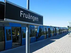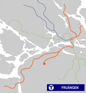 Fruängen metro station is the end station on line 14 of the Stockholm metro, located in the district of Fruängen. The station was opened on 5 April 1964 as the south terminus of the first stretch of the Red line, from T-Centralen.[2] The distance to Slussen is 8.1 km (5.0 mi). With the station platform at 47 metres (154 ft) above sea level, it is the highest situated in the Stockholm subway network.