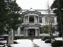 The old building, which had been formerly used as the main building of former Fukushima ordinary junior high school Fukushima-ken Jinjo Chugakko (福島県尋常中学校, Fukushima-ken Jinjō Chūgakkō), is conserved in the front of its site, as the Asaka history museum. It was designated a cultural heritage site in 1977. The museum was deemed unsafe to enter after the 2011 Tōhoku earthquake and tsunami.