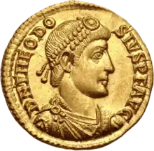 Theodosius granted refuge to the fugitives, though it took months for him to act decisively, indicating his reluctance in fighting a civil war at first.[9] His eventual commitment to the war was explained through how it benefited him politically, as it gave him the opportunity to get rid of Maximus, the stronger member of the imperial college.[10][11] As a result, he was married to Galla, while her family agreed to convert to religious orthodoxy, thus achieving a public image of dynastic and religious solidarity.[11][12][13]