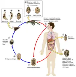 Paragonimiasis is a parasitic infection caused by the lung fluke genus, Paragonimus. It primarily affects humans (and other mammals) that consume raw or undercooked freshwater crabs, crayfish or snails infected with the parasite.[22] The transmission of paragonimiasis occurs through the ingestion of metacercariae, the infective form of the parasite. Once inside the human body, the metacercariae migrate to the lungs, where they develop into adult flukes.