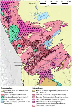 Large areas of the Namibian geology exposed onshore are associated with the Late Proterozoic Pan-African orogenic cycle.[1] The geology of Namibia is dominated in the north by metasediments of the Neoproterozoic Damara Belt (or Namibian System), while in the south large areas are underlain by the unmetamorphosed, relatively undisturbed sediments of the Cambrian Nama Group. Locally, within the Damaran terrain, inliers of older basement occur, for instance in the extreme northwest at the Kunene River the oldest rocks of the country belong to the Paleoproterozoic (about 2,100 Ma) Epupa Metamorphic Complex. Only slightly younger are metamorphic rocks of the Huab Complex west of Outjo. Similar ages are also recorded from rocks of the Grootfontain Metamorphic Complex in the northeast of the country.[2]