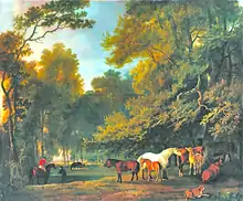 Sir George Colebrooke of Gatton Park in Surrey commissioned at least two paintings from Barret. Colebrooke was a London banker and also became chairman of the East India Company. He became the Member of Parliament for the rotten borough of Gatton in 1754 as a member of the Whig party and held office under the Marquess of Rockingham. However, his financial speculations led to his downfall and he was declared bankrupt in 1777. Sir George Colebrook had commissioned Capability Brown in 1762 to landscape Gatton and a painting by Barret, sold at Sotheby's in 2013, shows workmen completing the landscaping.[27] This painting was exhibited at the Royal Academy[28] with its counterpart, a view from the house overlooking the lake and the newly landscaped parkland[29] This painting shows Barret being influenced by Richard Wilson and moving towards a picturesque scene centred around a lake.